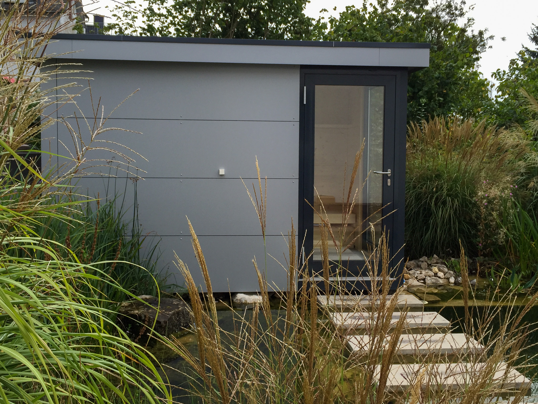 Schwebende Gartensauna. Eine moderne Alucobond-Verkleidung, großzügige Fensterfronten und die außergewöhnliche Konstruktion über dem Naturteich machen diese Sauna zum architektonischen Highlight. Perfekt integriert in die Umgebung verbindet sie moderne Gestaltung mit einzigartigem Naturerlebnis.