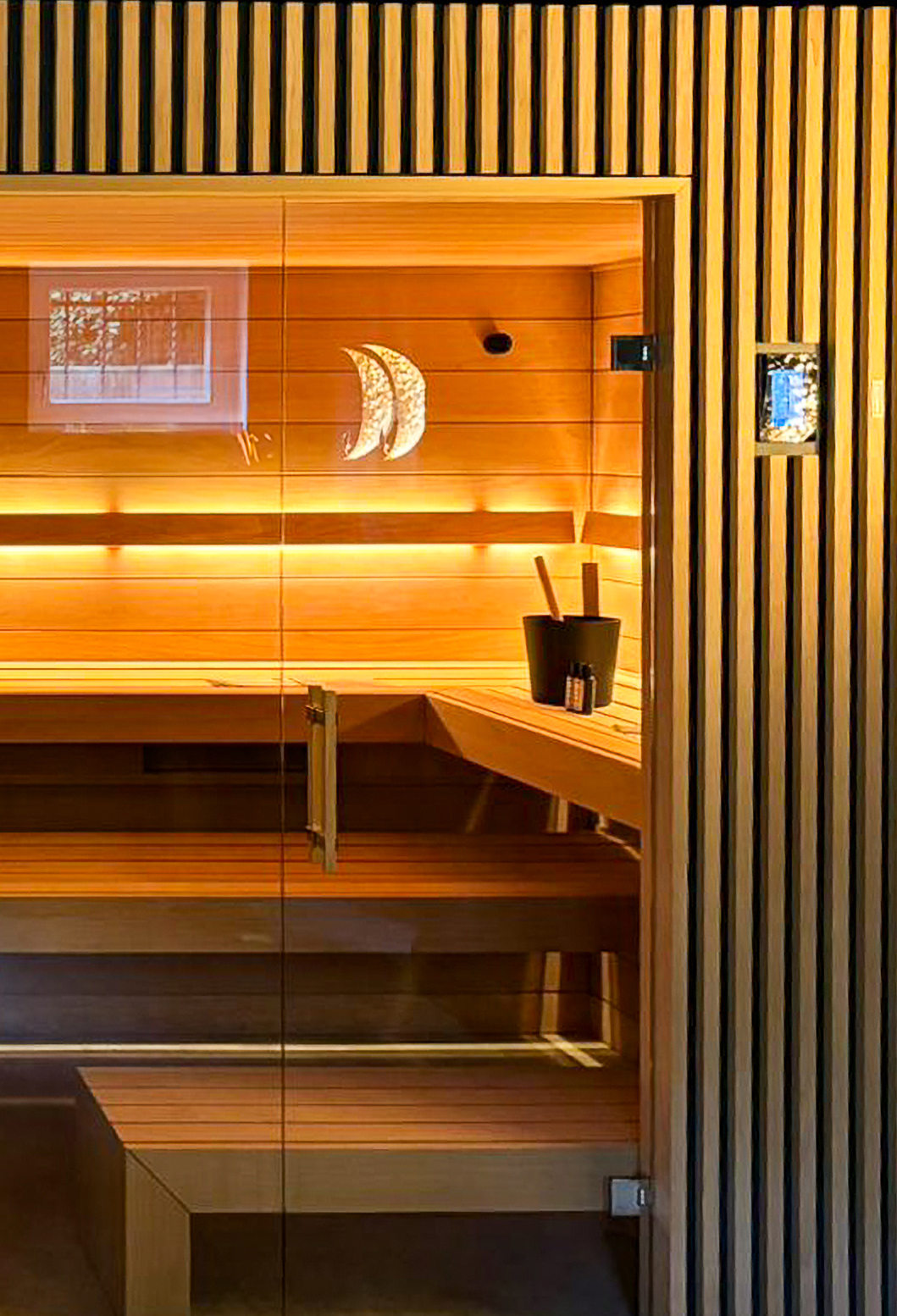 Besonderes Augenmerk verdient die handwerkliche Präzision: Jede Leiste wird individuell angepasst, kein Abstand gleicht dem anderen von der Stange – jedes Projekt ist ein echtes Unikat. Durch die Kombination von natürlichen Materialien, moderner Technik und maßgeschneiderter Ausführung ist im Keller eines Privathauses eine Sauna entstanden, die nicht nur praktisch, sondern auch ästhetisch ein echtes Highlight ist.